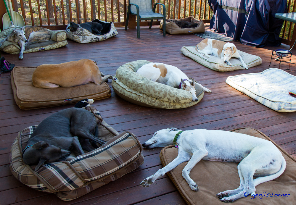 We had a little greyhound party in their honor. You can read more about it at Trina’s blog, My Roo Spot. I think the final tally was 16 dogs and 6 people. The scenery of dogs was always changing. Can you find all 10 here?